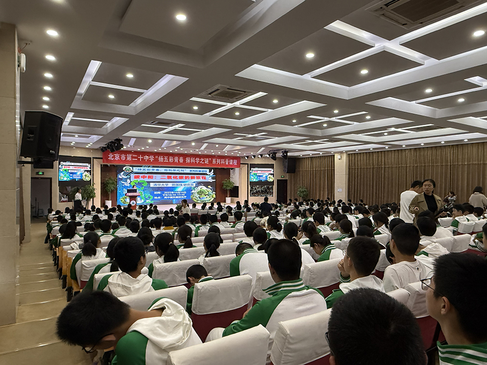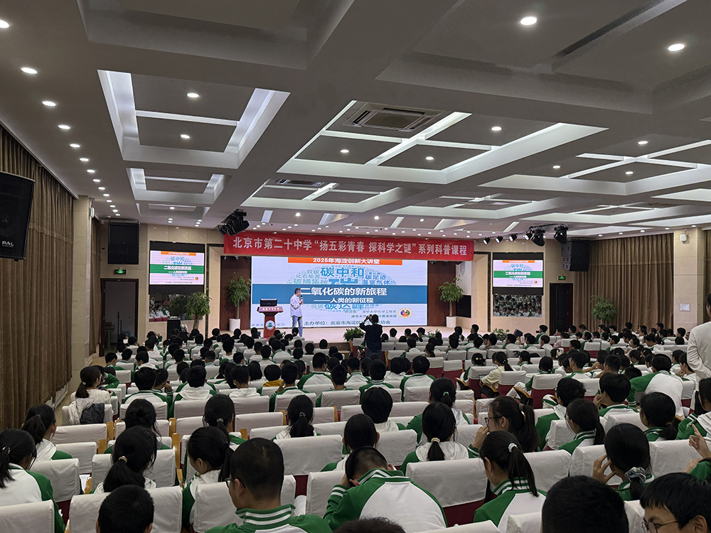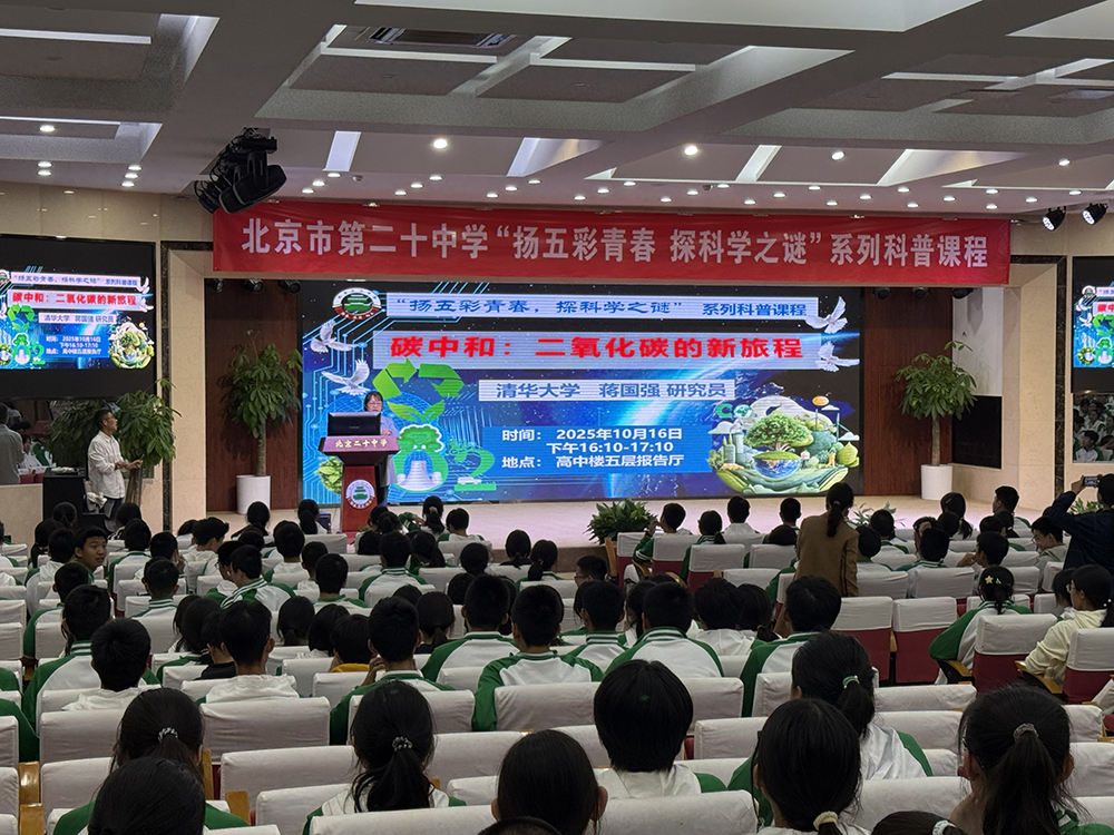 2025年10月16日16:10,北京市第二十中学大阶梯教室的讲台上,“扬五彩青春,探科学之谜”的红色横幅格外醒目。来自清华大学的蒋国强研究员为大家带来“碳中和——二氧化碳的新征程”主题讲座,为高一年级全体学子开启了一场关于人类可持续发展的科学启蒙盛宴。