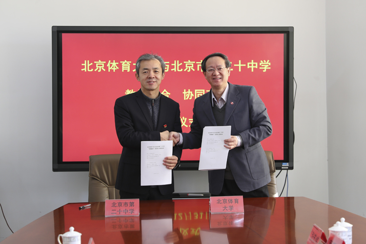 为深入推进育人方式变革,促进每一个孩子全面而有个性的成长,在市、区教委的指导下,北京市第二十中学与北京体育大学签定协议,探索“教体融合,协同育人”的新模式,北京市第二十中学加挂“北京体育大学附属中学”,全面提升学校体育工作质量和培养拔尖体育人才。两校将围绕竞技体育后备人才贯通培养,丰富学校体育课程建设,共享场地及教育资源等方面开展合作。