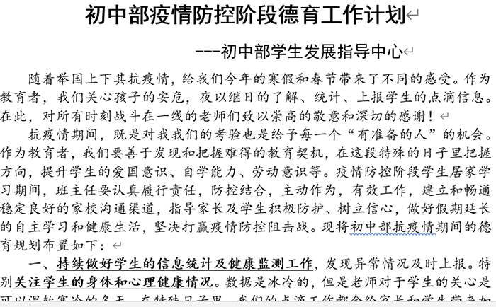 《初中部疫情防控阶段德育工作计划》里还有更多的教育细节要求,如果能在家长指导下认真做好,相信同学们居家防控疫情的同时,德育教育成果定能和在学校一样丰富多彩!