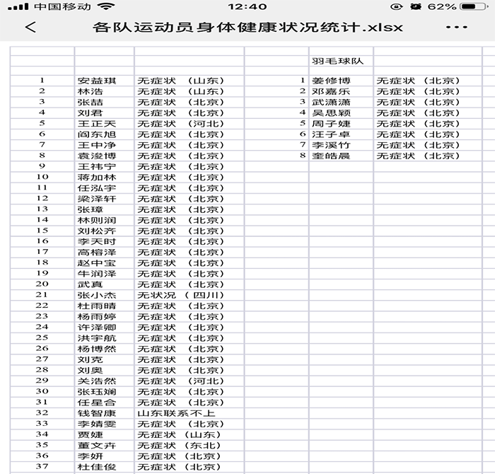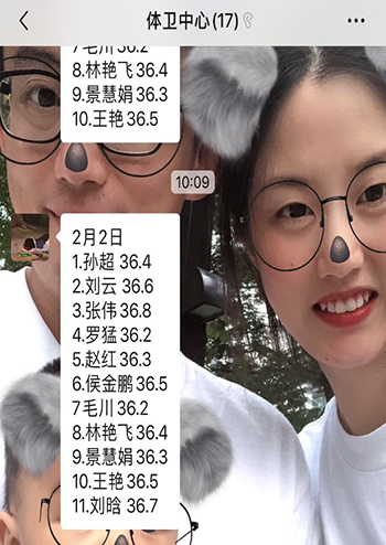 为了营造守土有责,主动作为的工作氛围,本次体温情况上报工作做到了责任压实到人,并保障及时、全员上报。教师体温情况由孙超主任负责统计,运动队全体学生体温由各教练员每日向张伟老师进行汇总。截止发稿,体卫中心14名教师、116名运动员(田径队、篮球队、足球队、羽毛球队、体育舞蹈队、健美操队)均自行居家隔离,无发热情况。