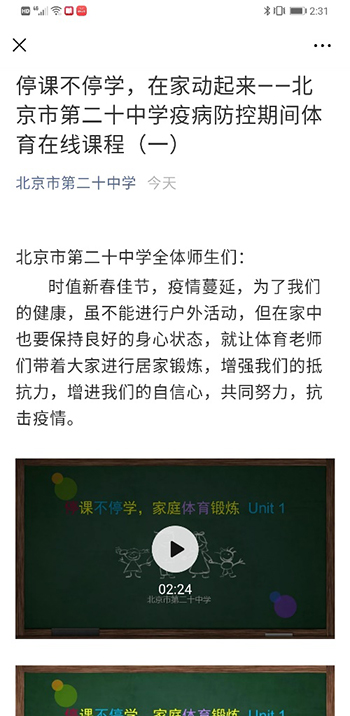 为了响应上级停课不停学的工作要求,督促学生维持身心健康,增强身体抵抗力,保持积极乐观的心态,迎接新学期的到来,近期北京二十中学体卫中心几位初三体育老师在家为学生录制了家庭体育锻炼视频,并通过校园网、学校微信公众号向社会推出“停课不停学,在家动起来——北京市第二十中学疫情防控期间体育课程在线(一)”,号召学生在家因地制宜,坚持体育锻炼!