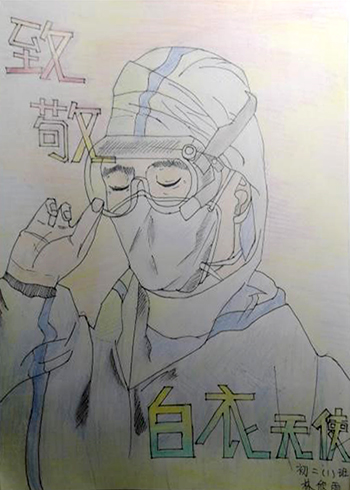初二4班陈慧欣等几位同学也为抗战疫情一线的白衣天使写了一封信:“年前因为新型冠状病毒的出现,使我们措手不及,也导致你们春节不能回家与亲人团聚,我想你们一定吃了不少苦吧!你们总是穿着厚厚的防护服,连喝水、上厕所的时间都几乎没有。但在这可怕的疫情面前,你们没有选择退缩,反而顽强地与病毒作斗争,我由衷地敬佩你们,向你们表达最诚挚的敬意。你们在前线奋战,废寝忘食争分夺秒地救护患者,我们也不能给你们拖后腿。我会尽量不出门,呆在家里好好学习;也知道了出门要戴口罩,勤洗手,不去人多的地方,不听信谣言,也不乱传谣言。我知道这次病毒有多可怕,疫情严重,国家已经启动一级响应,这是一场没有硝烟的战争。但是我们也不害怕,我们相信奋战在抗疫一线的你们,相信自己伟大的祖国,相信在全社会的共同努力下,一定能够打赢这场疫情狙击战!”