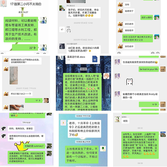每天班主任和科任教师都积极承担学生在家学习期间的联系和指导学生的任务,每天向学生了解相关情况,通过电话、网络等各种方式做好学生的答疑、指导线上线下加强对学生学习的指导和督促。