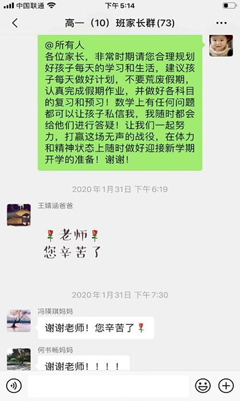 高一年级组织教师对重点科目的寒假作业中的典型题目制作微视频发布在班级群里,制定了利用各种平台对学生进行学习辅导规划,整合教育资源,通过网络、电视、移动终端等方式,开展网上教学、自主学习和在线辅导答疑,保证推迟开学不停教学,学生推迟到校不停学习,全力以赴做好延期开学期间教学安排组织工作。