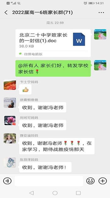 各班班主任们建立了良好畅通的家校沟通渠道,积极保持与学生及家长联系,密切关注返京学生以及处于隔离期的医学观察进展情况。年级高度重视疫情防控知识的正面宣传引导,积极发挥家委会在家校沟通过中的正向引导,引导家长积极关注“首都教育”“海淀教育”等微信公众号,及时了解政策信息,同时通过学校公众号、年级家长群、班级家长群、班级学生群等方式做好学校层面的信息发布,使家长安心放心。积极进行疫情防控知识宣传,引导家长和孩子做好自我安全防护,坚决不信谣、不传谣,积极传播正能量,树立战胜疫情的信心,有效助力疫情防控工作取得胜利。