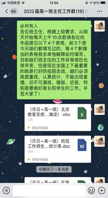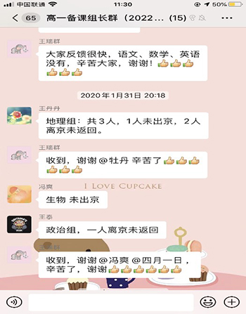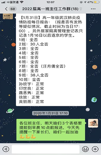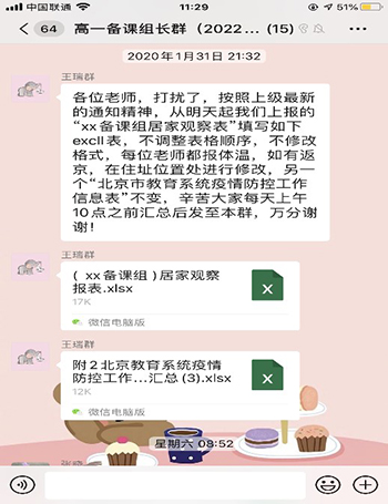 年级实行以各班级为单位的“日报告”制度。全年级十位班主任恪尽职守、敬业负责、积极沟通,高效运作,认真做好班级每位学生的信息统计及健康监测工作,时时关注班级家长群接龙情况,建立居家管理学生群,每日上午 10 点前准时提交本班《北京教育系统疫情防控工作信息统计表(海淀)》《防控工作师生人数统计表》《居家隔离管理登记表》《区属各单位春节期间离京返京情况统计表》4 份表格,保障年级及学校统计工作的顺利完成。疫情防控方案细致,统计数据清晰,疫情筛查透明,切实保障了年级各项工作有序指挥、及时决策。