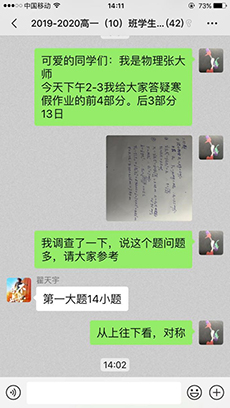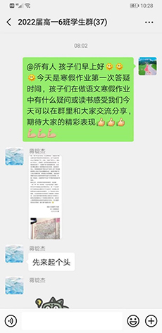 从年级到各备课组,各学科统筹安排,步调一致;从班主任到任课老师,各班级学科间相互配合,有条不紊;从班级群到家长群,班主任及时汇总与反馈,使寒假作业答疑活动家校共同参与、指导。