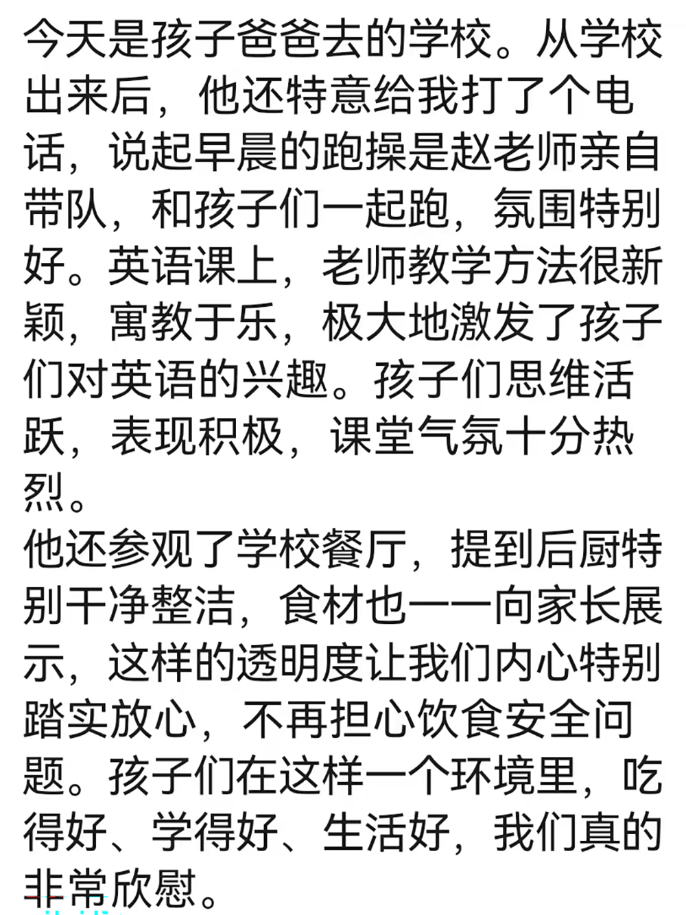 家长们表示,走进初中课堂,看到孩子们专注思考、积极互动的状态,以及老师生动有趣、逻辑清晰的教学方式,彻底打消了此前对孩子适应初中学习的顾虑,“课堂氛围特别好,老师能精准抓住孩子的注意力,孩子的参与度也高,这样的教学我们特别满意”。 同时,家长们对校园环境也赞不绝口,无论是窗明几净的教室、规整有序的课间活动,还是干净卫生的食堂环境,都能感受到学校管理的细致与用心,“孩子在这样的环境里学习生活,我们特别放心”。