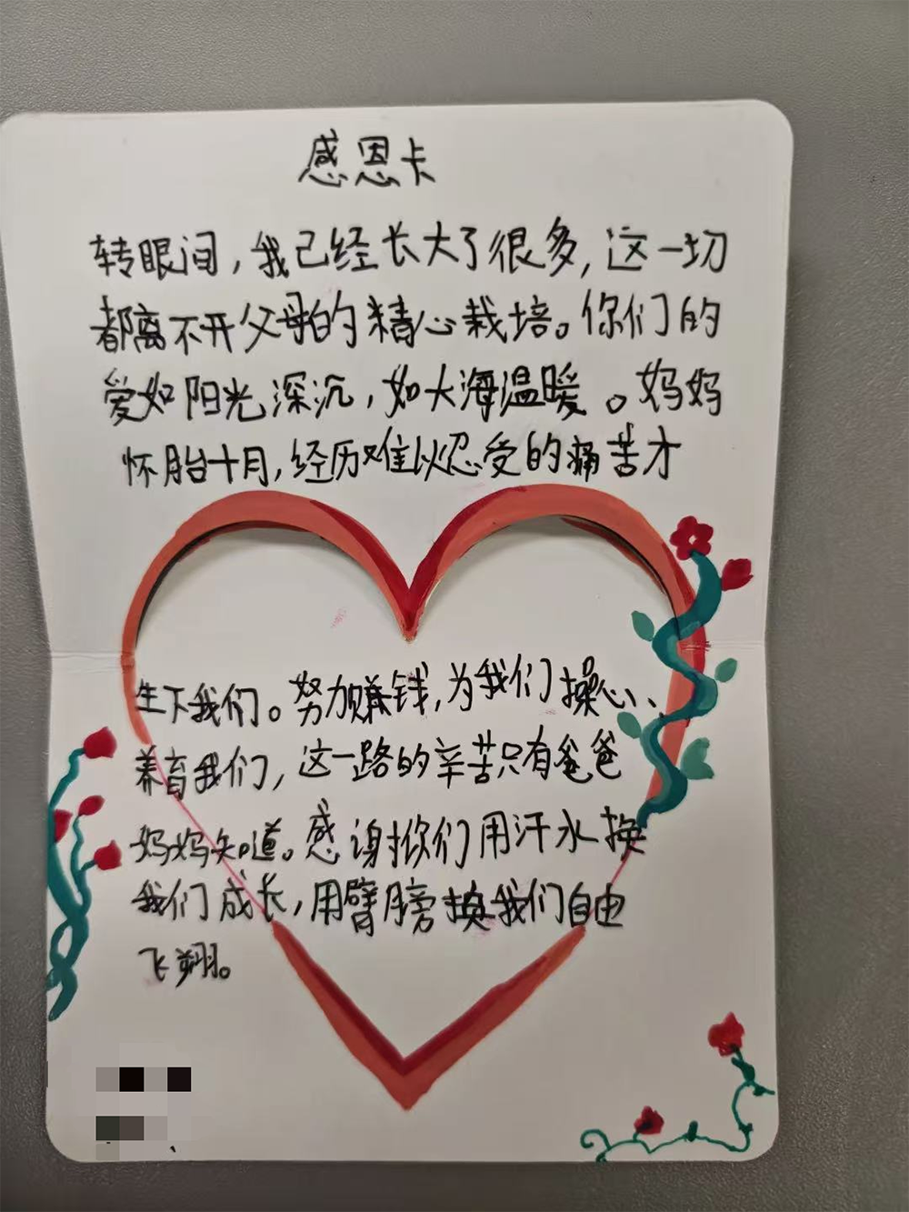 一张张卡片没有华丽的辞藻,却满含真诚与爱意,成为连接孩子与家长的暖心纽带。 当家长们收到孩子亲手书写的感恩卡时,不少人眼眶湿润,纷纷表示“没想到孩子这么懂事,能记住这些小细节”“第一次收到孩子写的感恩卡,感觉他真的长大了”。