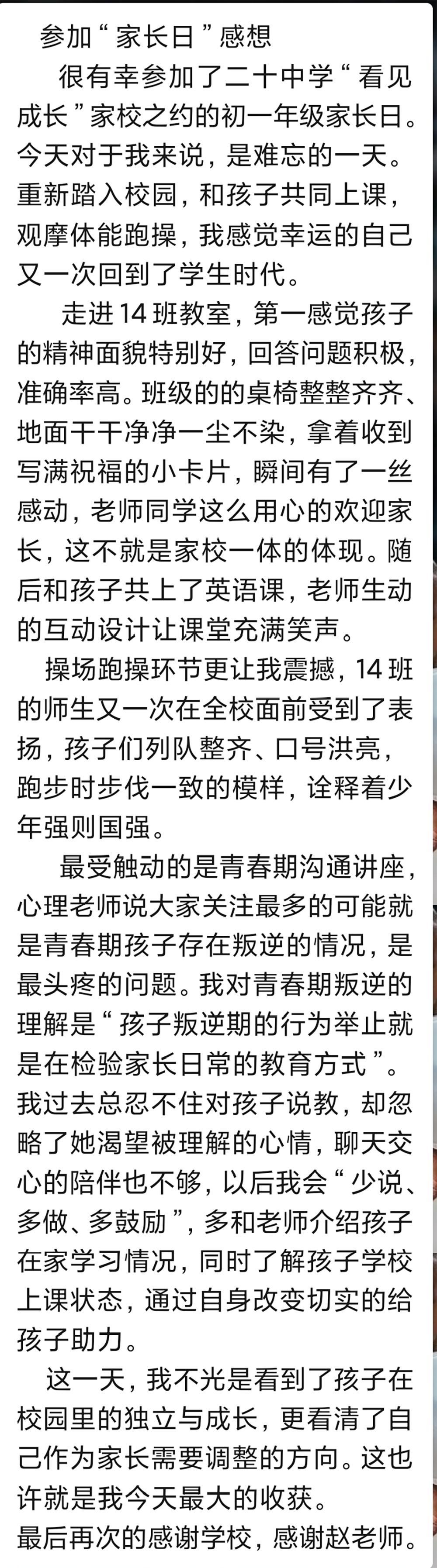 本次初一年级家长开放日活动,不仅让家长 “看见” 孩子进入初中后的成长变化,也让学校 “听见” 家长的真实心声。未来,北京市第二十中学将继续聚焦初一年级学生的适应与发展,不断完善家校协同育人机制,为每一位初一学生的健康、快乐、卓越成长保驾护航。