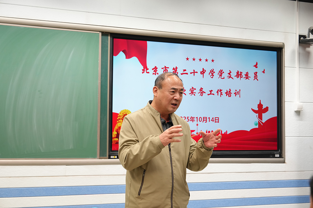 为进一步提升支部委员履职能力,强化学校党建宣传工作质效,2025年10月14日下午,北京市第二十中学党委召开支部委员实训会,旨在提高教师们校园新闻写作能力。会议特邀资深媒体人邹德智记者(中国教育电视台)担任主讲,学校党委书记孙玉柱、副校长吴刚、新都校区执行校长宋诗伟出席活动,支部书记、支部宣传委员、支部纪检委员、集团校教师代表及学生代表共计50人参加此次会议,本次会议由党政办公室副主任刘馨临主持。