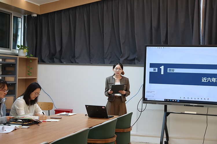 在专题汇报环节,青年教师与学科骨干分享了高考三角形劣构问题的案例与系统化的研究成果:高三袁蒙蒙老师主张在高一起始教学中突破“知三求三”的固定模式,让学生在主动建构对三角形边角关系的理解。高一刘姗老师提出要培养数形结合能力,引导学生主动挖掘题干隐含信息,提升学生对劣构问题条件的整体辨识与逻辑判断能力。高二卫亚楠老师创新性地提出“双向分析”教学策略:在代数层面,通过正余弦定理和方程思想进行严谨推演;在几何层面,借助图形构造和轨迹分析培养直观洞察能力,从而有效落实数形结合的核心素养要求。