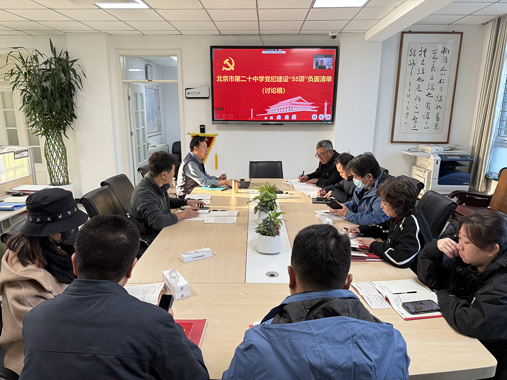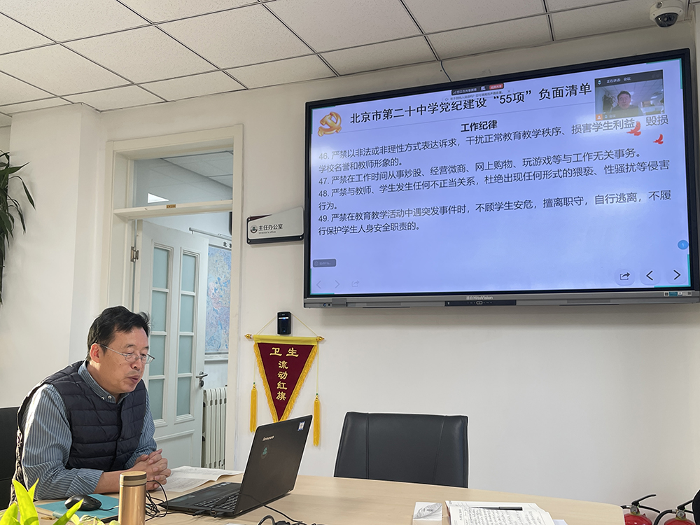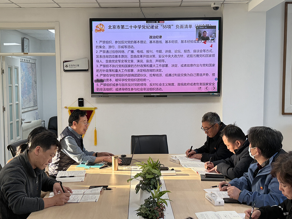 伊红旗书记带领大家学习《北京市第二十中学党纪建设“55项”负面清单(讨论稿)》。伊书记梳理清单核心要点,结合教育系统典型案例,深入解读“严禁违规收受礼品礼金”、“严禁有偿补课”等与教师职业密切相关的纪律条款,让抽象规定转化为具象警示。党员教师们通过学习明确了严禁接受家长宴请、严禁利用职务之便谋取私利等红线,今后将以“清单”为镜,时刻校准言行。