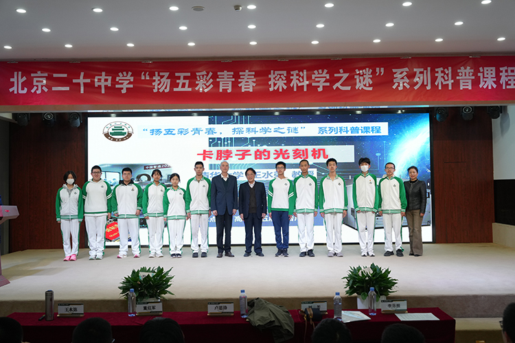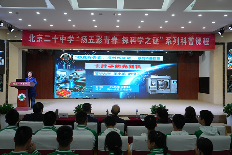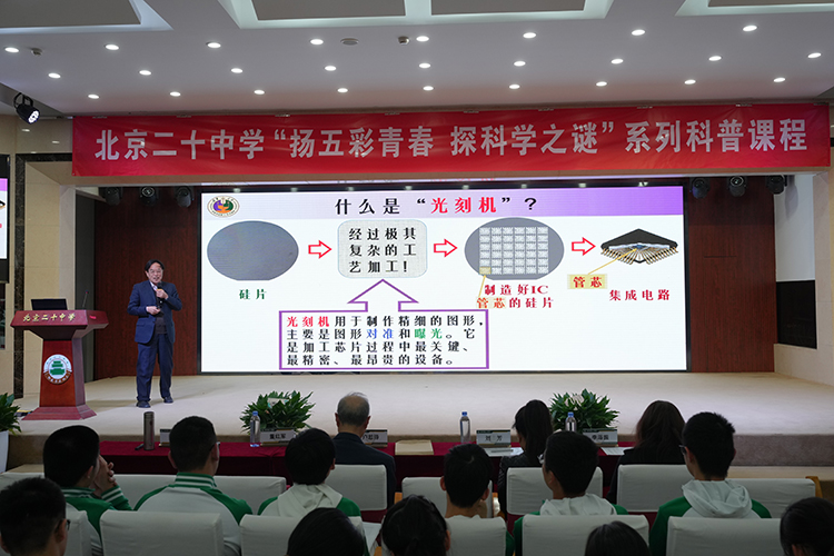 4月9日,北京市第二十中学“扬五彩青春,探科学之谜”科普讲座在学校礼堂举行。北京市教育系统关工委副主任卢思峰、海淀区教育系统关工委副主任刘芳、北京第二十中学教育集团校长董红军、副校长李浴振等领导出席。清华大学王水弟教授应邀作《卡脖子的光刻机》专题讲座,通过生动讲解、实物展示与视频演示,带领同学们探秘芯片制造核心技术,激发科技报国热情。