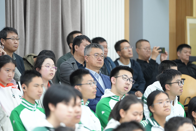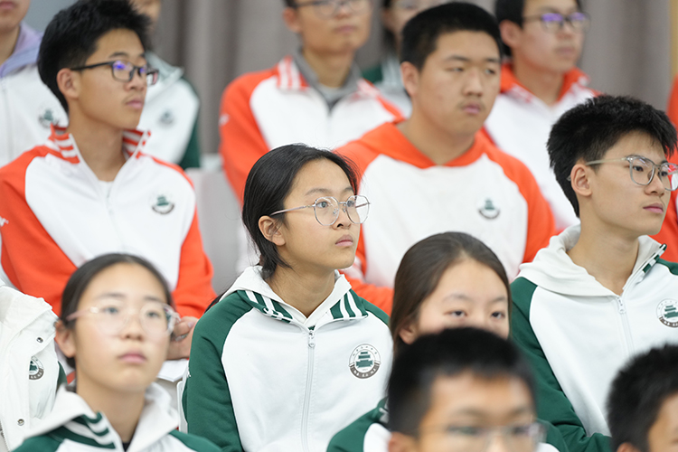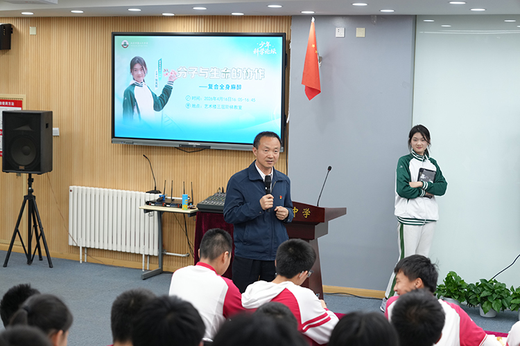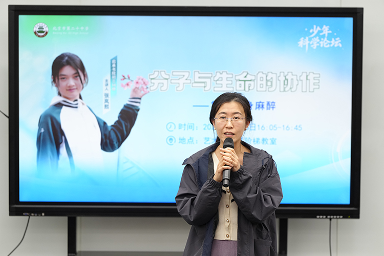 2026年4月16日下午,由学校贯通培育中心组织的“少年科学论坛”在艺术楼三层阶梯教室如期举行。初三18班张岚熙同学为在场师生带来了一场题为“分子与生命的协奏——复合全身麻醉”的精彩演讲。本次论坛由贯通培育中心陈平主任主持,董红军校长、内蒙古校长团一行以及来自初二至高二各年级的学生代表共同聆听了这场科学与哲思交织的分享。