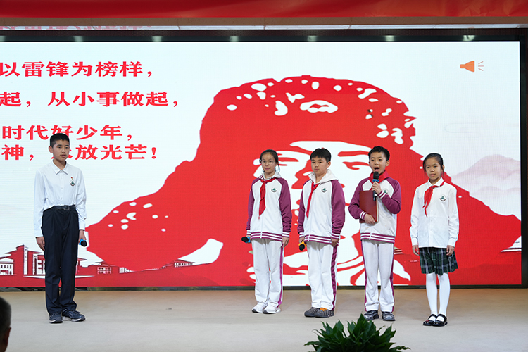 在各年级总结展示环节,初一、初二、高一、高二四个年级的代表依次上台分享。同学们用生动的故事、鲜活的案例,展现了全校师生践行雷锋精神的丰硕成果:从为盲童录制有声书、社区志愿服务,到校园内的互助行动、公益实践,每一份分享都承载着同学们对“赠人玫瑰,手有余香”的深刻理解,诠释了“知行合一,止于至善”的追求。