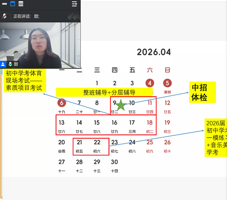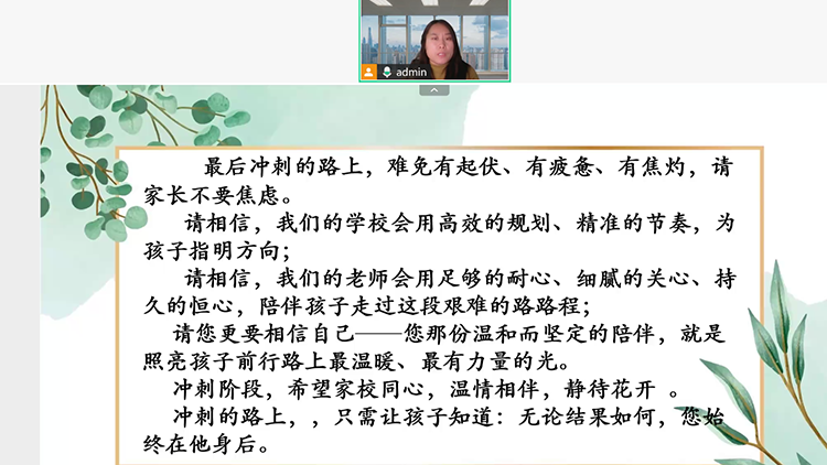 然后,冀甜主任围绕家长高度关注的重点工作进行细致解读与部署,从中考体检安排、体育考试注意事项、阶段性复习备考计划、招生政策等关键内容逐一讲解,信息详实、重点清晰,为家长厘清备考节奏、做好后勤保障、配合学校工作提供了明确指引,切实解决家长关切问题。