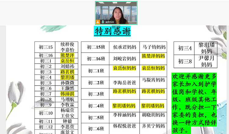 本次初三年级家委会会议由齐豪杰主任主持,她首先代表年级对家委会一直以来给予年级工作的理解、支持与默默付出致以最诚挚的感谢。