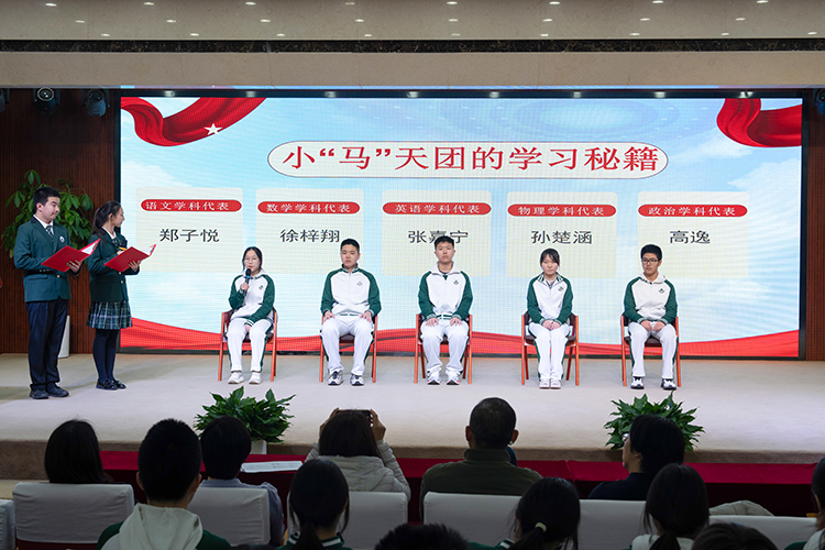 在“小马天团”学习秘籍分享环节,五位学科达人轮番登台:郑子悦展示“语文作文素材的选用方式”,徐梓翔揭秘“数学基础复习要点”,张嘉宁演绎“英语情境记忆法”,孙楚涵演示“物理答题逻辑链”,高逸传授“道法题型攻克术”。他们用生动的案例和实用的技巧,为同学们送上定制化学习“秘籍”。