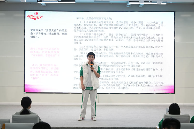 在“回望初心”环节,张老师以“半条被子”“脱贫攻坚”两个故事生动诠释“全心全意为人民服务”的宗旨,指出党章是共产党人用热血和温情写就的承诺,学员们结合自身感悟分享对“吃苦在前,享受在后”的理解,进一步坚定了服务集体的意识。随后在“精神淬炼”环节,张老师梳理党章发展的关键节点,展现党章随时代不断完善的过程,强调铁的纪律是党屹立不倒的根基、思想统一是凝聚力量的灵魂,并带领全体学员庄严宣读入党誓词,以铿锵誓言激发奋进动力。在“探寻密码”环节,张老师对比不同时期的党章内容,揭示党章在指导思想与时俱进、制度不断完善的同时,始终坚守党的性质、宗旨和初心使命。最后的“青春对话”互动环节中,学员们结合学习生活实际分享感悟,有的谈到纪律意识的重要性,有的强调服务精神是青年的担当,还有的表示要将理想融入中华民族伟大复兴的中国梦。