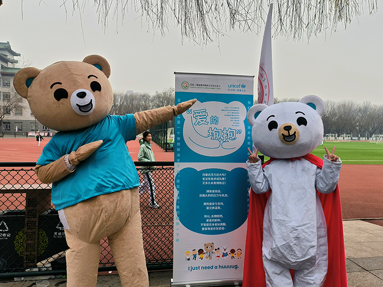最温暖的是“拥抱加油站”。两只由志愿者同学扮演的玩偶熊早早来到现场,穿着略显笨重的服装却依然主动向路过的同学张开双臂。起初同学们有些害羞地观望,直到第一个勇敢的拥抱发生——接着是第二个、第三个……有人紧紧相拥,有人轻轻握住熊爪,每个拥抱后,玩偶里都会传来一声轻轻的“加油”。那一刻,温暖变得如此具体。