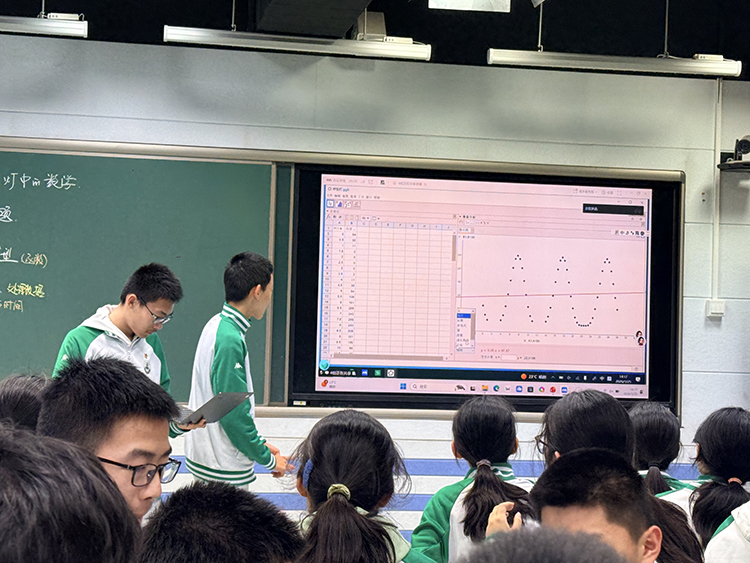 课堂上,杨老师将AI工具的应用贯穿“课前任务设计—课中探究建模应用—课后优化”全流程,实现了从“AI辅助教”到“AI辅助学”的转变,构建起人机协同的多元学习生态。课前,指导学生借助AI工具,为呼吸灯设计任务搭建思路框架,培养学生利用AI获取信息、分析问题的能力;课堂中,以车载呼吸灯亮度数据为探究载体,引导学生利用信息技术手段处理分析数据,探究函数模型,亲历“数据收集—直观表征—模型猜想—拟合验证”的数学建模核心过程,突破离散数据规律挖掘的难点。